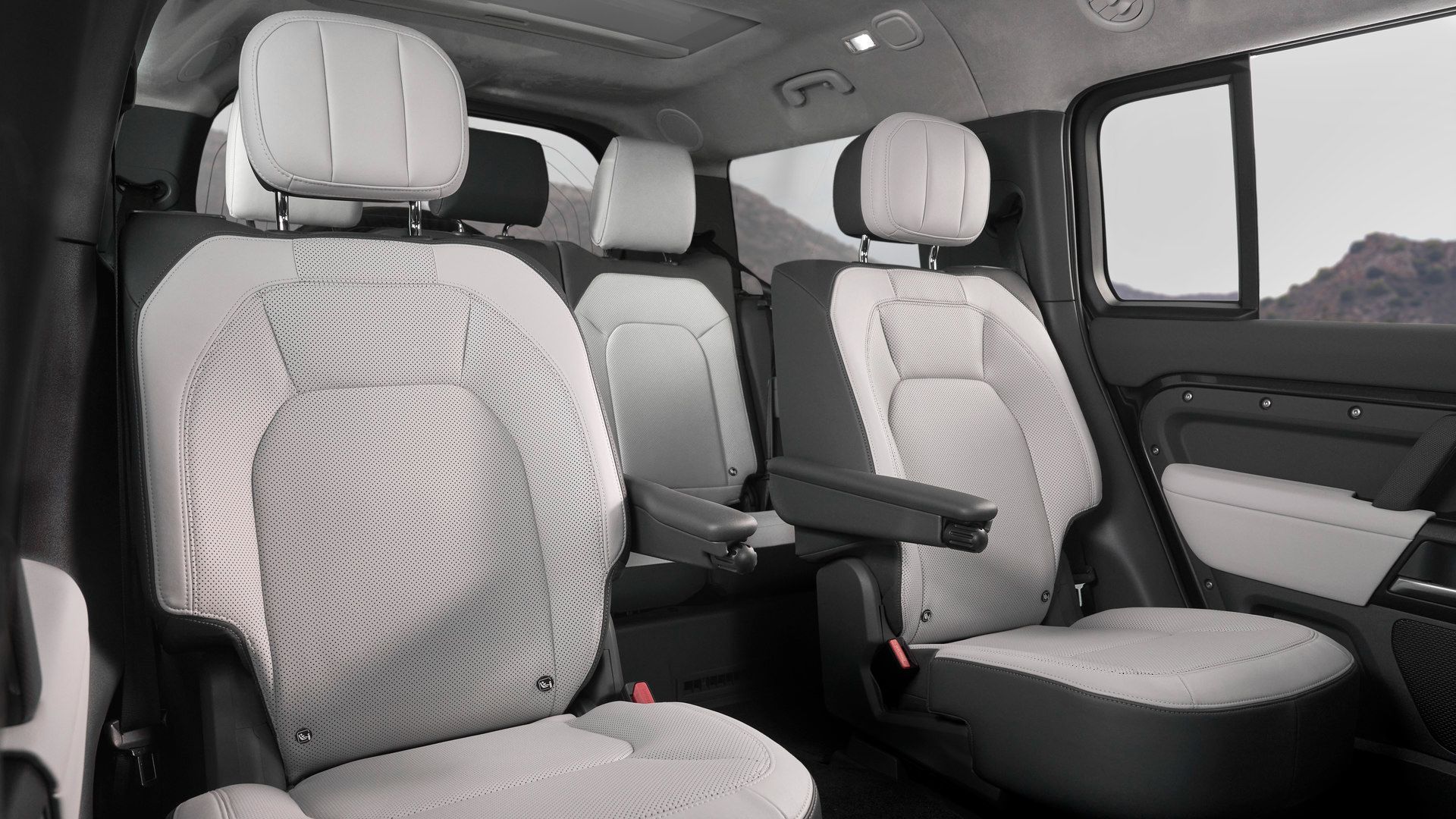 The Captain's Chairs Pack replaces the Defender 130's standard three-passenger second-row bench with two individual seats separated by a walk-through passage to the third row. This configuration reduces total capacity from eight passengers to seven while significantly improving comfort for second-row occupants and third-row accessibility.